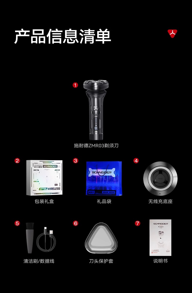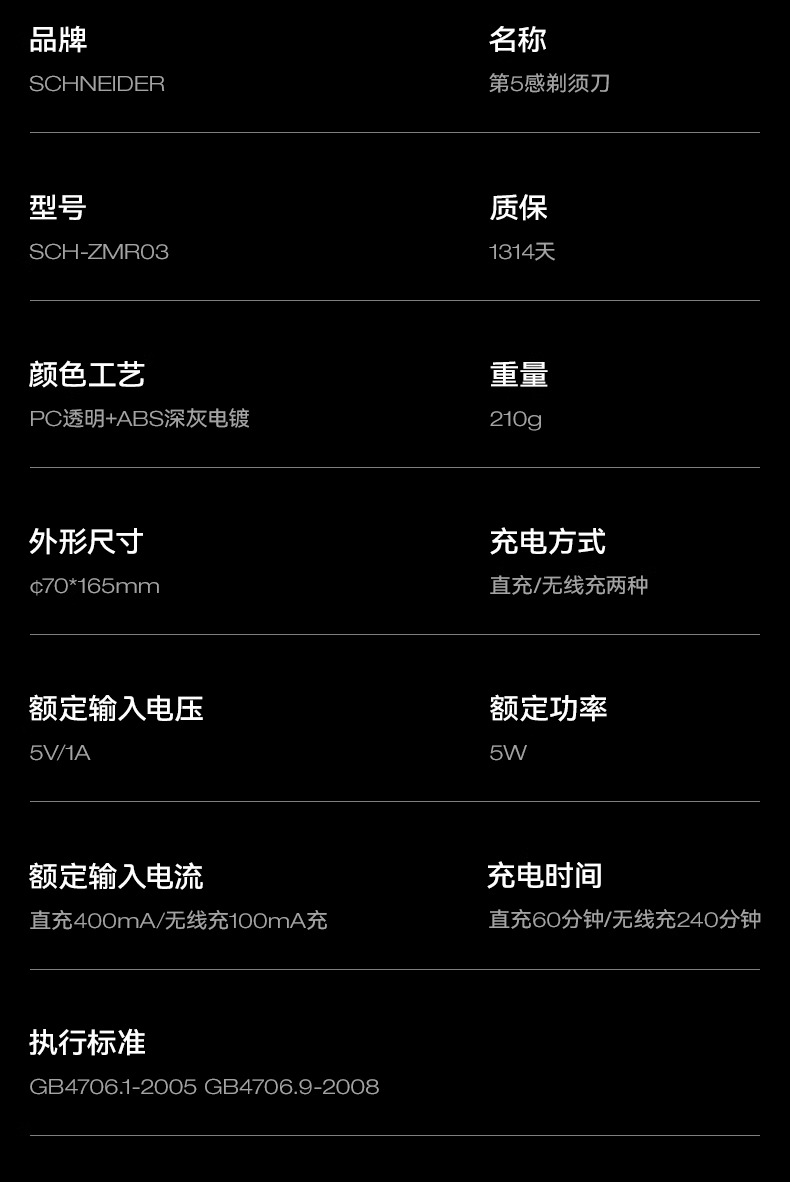 SCHNEIDER(施耐德)剃须刀 SD-SCH-ZMR03 星珀黑 PC+精钢刀头 充电时间:直充60分钟 无线充240分钟 续航时间:90分钟 额定功率:5W